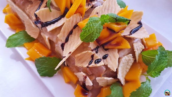 2.- Pelamos los mangos, (reservamos un mango) el resto lo trituramos con el azúcar. Ponemos en remojo las hojas de gelatina en un poco de agua fría 5 minutos, hasta que se ablanden. Calentamos la gelatina con el agua 1 minutos en el microondas y dejamos que se temple. Cortamos la mitad del mango reservado en dados pequeños, mezclamos los dados de fruta con el puré de mango. Añadimos la gelatina templada y lo mezclamos todo bien.