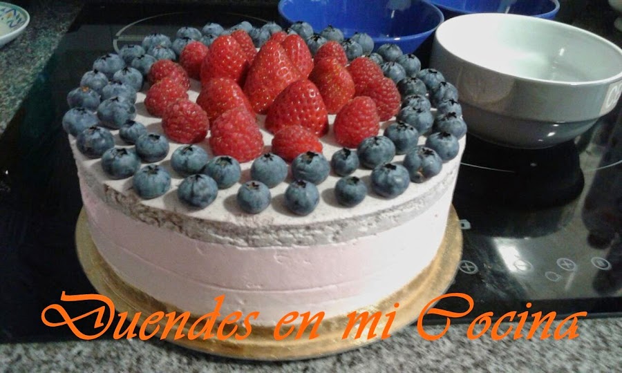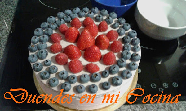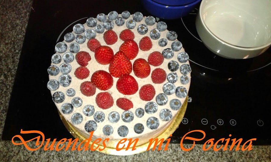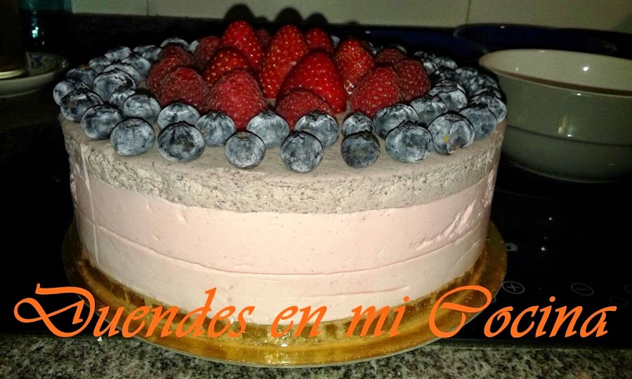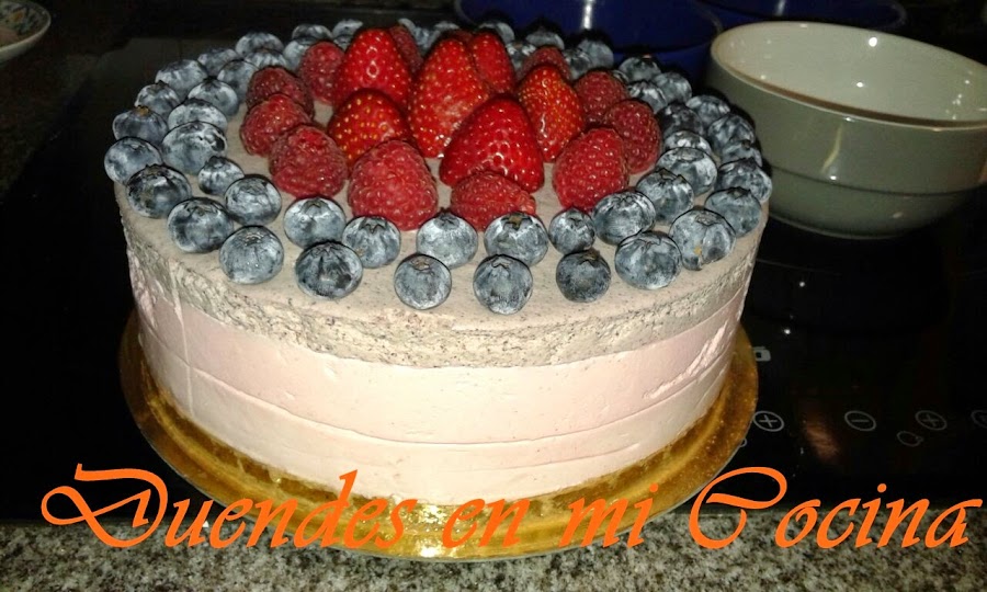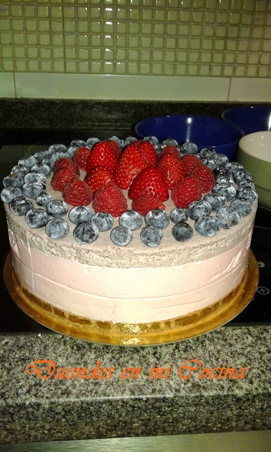 Hola de nuevo, aquí os dejo una de las tartas que hice últimamente, una delicia compuesta de tres mousses, arándanos, frambuesas y fresas, con base de galletas.