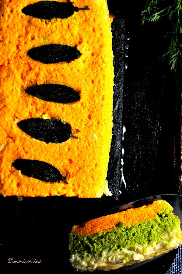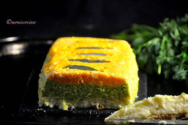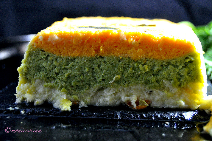 Untamos un molde rectangular con mantequilla y espolvoreamos con queso rallado. Vertemos el puré de calabaza, con cuidado encima el de guisantes y encima el de puerro/patata.