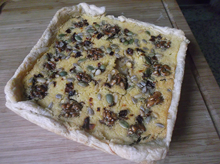 Volcamos sobre la lámina de hojaldre y decoramos con las semillas y las nueces.