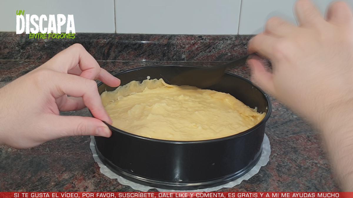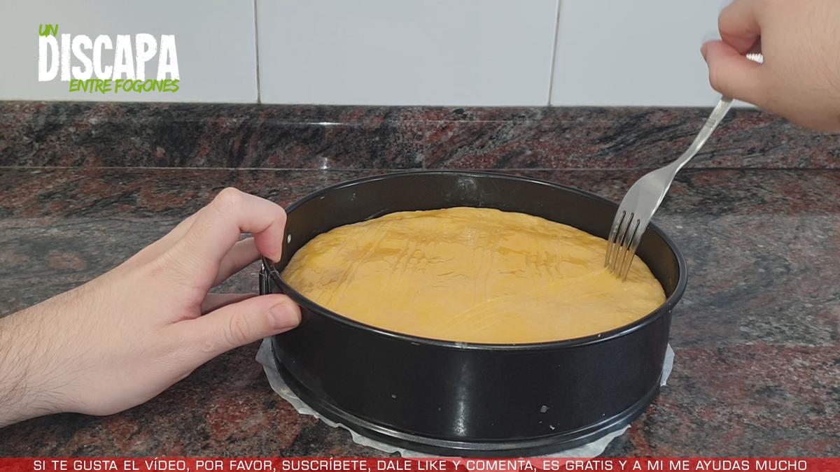 1Aquí tengo un molde de unos 22 centímetros de diámetro al que le he puesto papel de horno en la base para ayudar a desmoldarlo mejor.