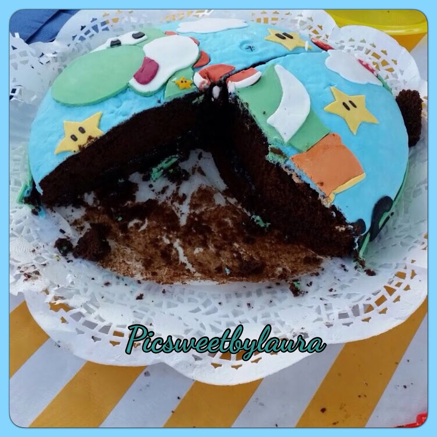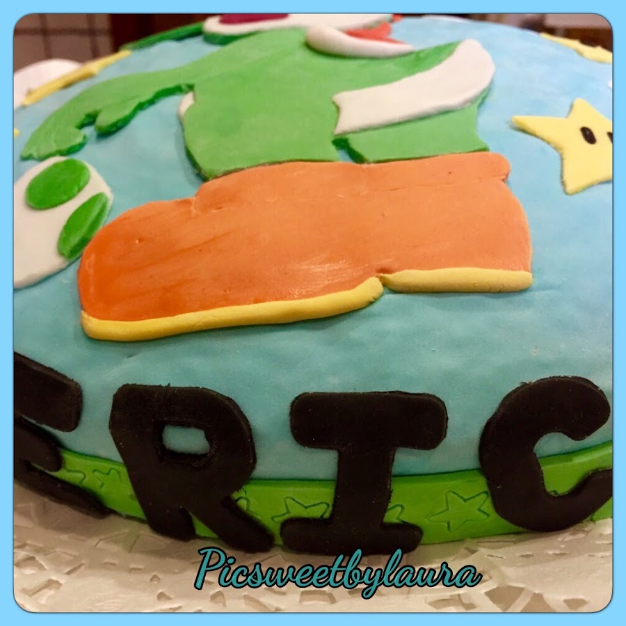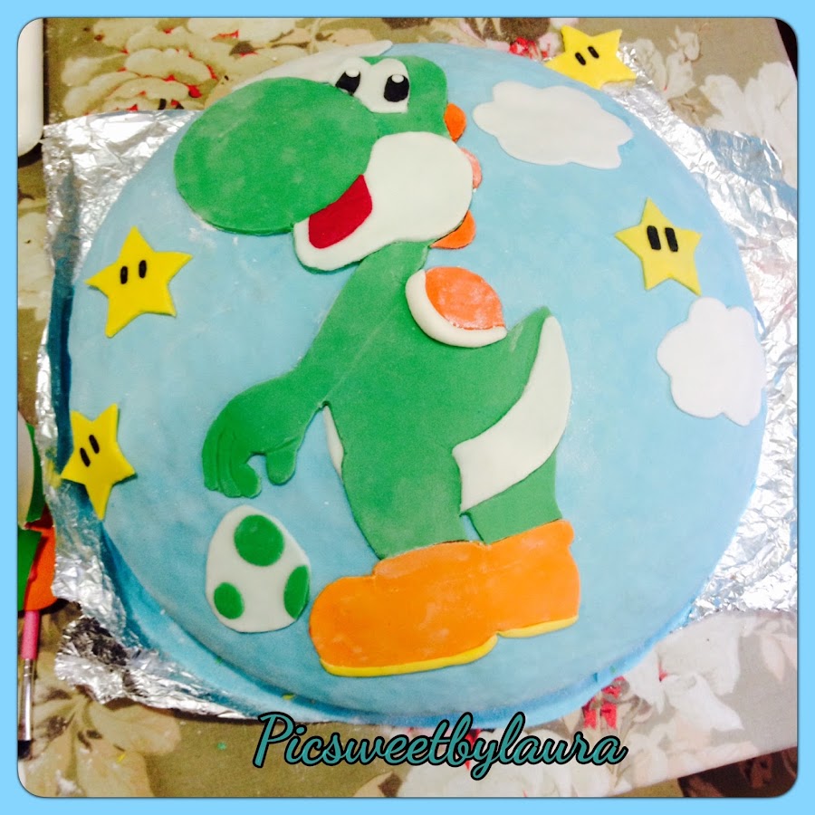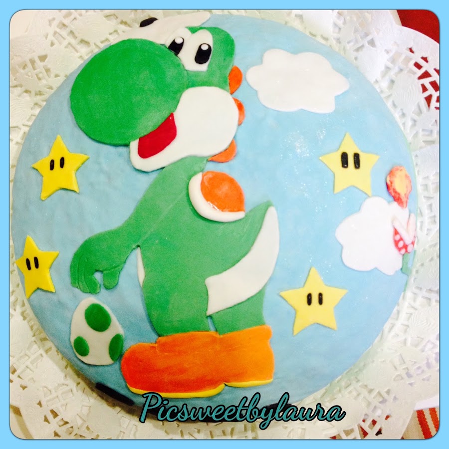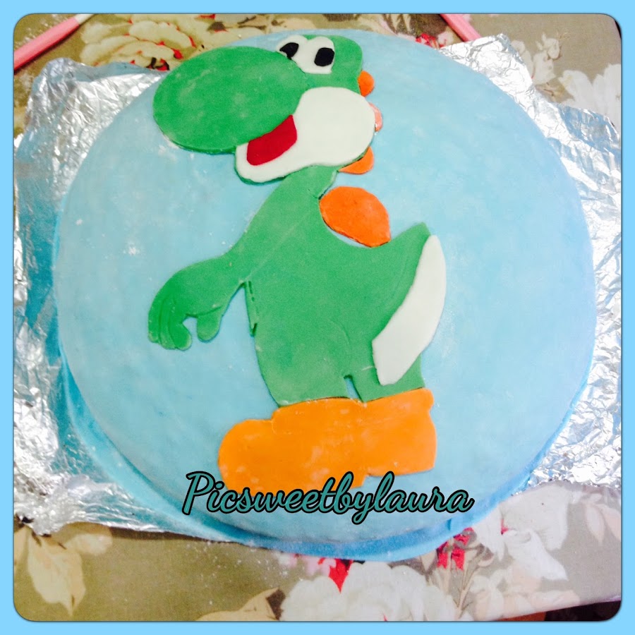 Trabajé el fondant (las decoraciones las había hecho el día anterior) y forré. Luego fui añadiendo las decoraciones, dibujitos y demás con la ayuda de un poquito de agua. Y como toque final un poco de purpurina nacarada. Y voilà, pastel Yoshi para un peque que cumplió 4 años.
