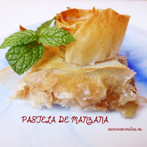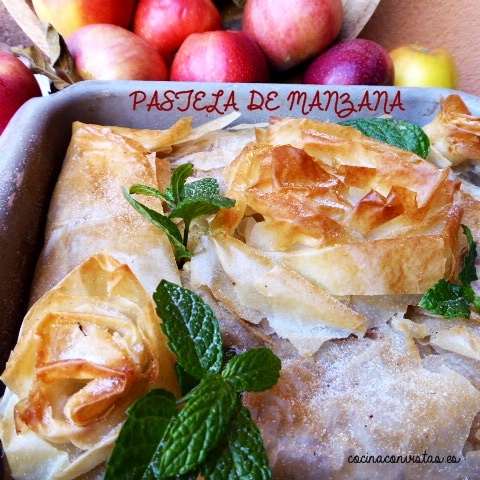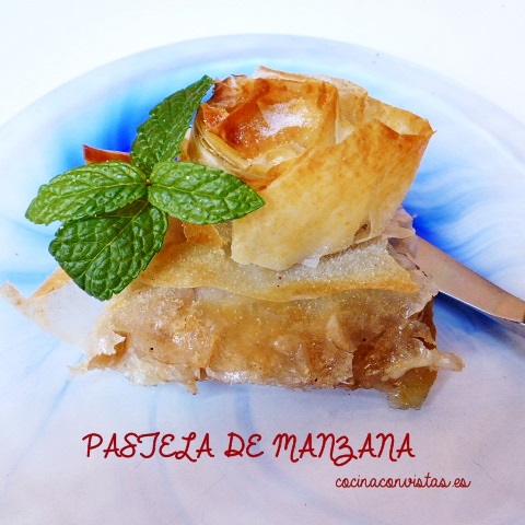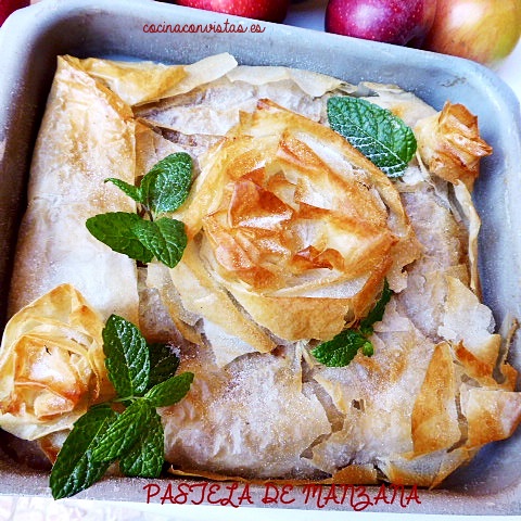 Untamos el fondo del molde que irá al horno con aceite de girasol. Con ayuda de una brocha vamos pincelando las hojas de phylo y las colocamos en el molde. Todas las hojas deben estar “pintadas” de aceite por la cara superior (al colocarlas una encima de la otra la cara superior de la primera le transmite el aceite a la que va encima). Colocamos las cuatro hojas dejando que sobresalgan un poco del molde (para luego “tapar” la masa de manzanas) y sobre ellas vertemos el relleno de manzana. Cubrimos con los bordes de masa y si es necesario ponemos alguna hoja más para que quede bien cubierto el relleno. Con las otras hojas de filo, también untadas de aceite formamos rosas que colocamos sobre la pastela.
