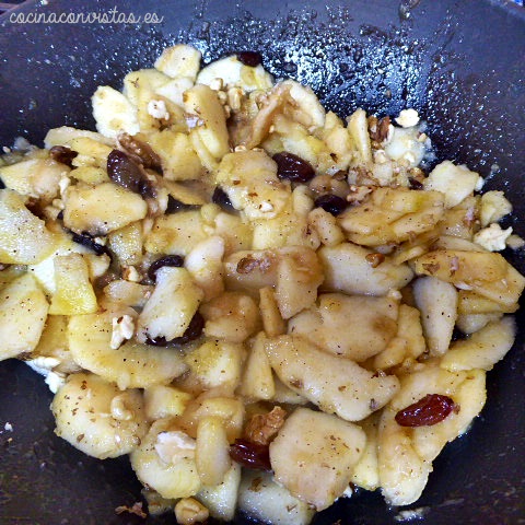 En una cazuela o sartén ponemos la mantequilla a fuego bajo, añadimos el azúcar y cuando esté todo fundido vertemos las manzanas y las pasas. Dejamos que se cocinen, removiendo de vez en cuando, durante 10 minutos. Añadimos la canela y las nueces, removemos y dejamos un par de minutos más.