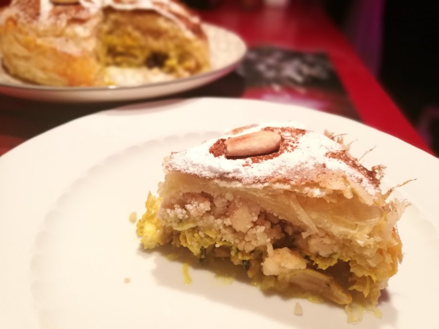 9. Cogemos un molde redondo y lo engrasamos y vamos pincelando cada masa de pasta filo con mantequilla por todos los sititos y la parte de la mantequilla la ponemos cara abajo en el molde iremos poniendo como tres capas y cubrimos bien todo el molde, a continuación, echamos el pollo y volvemos a tapar con masa filo de la misma manera siempre pinceladas con mantequilla y vamos cubriendo como dos tres laminas y echamos la pasta de huevo y repetimos la operación así hasta terminar con la mezcla de azúcar y almendras y volvemos a cubrir con masa filo con los bordes de masa que nos quedan a los lados los recogemos todo como haciendo un paquete y cogemos una ultima hoja de masa filo y la ponemos encima para que quede mas bonita y la pincelamos con la yema batida. El horno lo tenemos que tener caliente a 180º previamente con calor arriba y abajo y lo metemos en la bandeja del medio durante 25 minutos o hasta que este dorado , lo sacamos lo dejamos enfriar los desmoldamos y decoramos con azúcar glas, canela y almendras y listo. Os recomiendo ver el video para que se vea mas claro. Espero que os guste!!