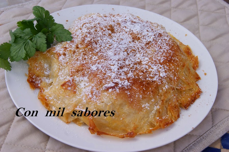 En un molde desmontable, debidamente engrasado,colocamos cuatro hojas de pasta filo debidamente engrasadas, añadimos el relleno y cerramos bien con otras cuatro hojas de pasta engrasadas, remetemos para que no se salga el relleno y horneamos a 180 grados , unos 15 ó 20 minutos hasta que la pasta esté bien dorada y crujiente.Espolvoreamos con azúcar glas y canela y servir.