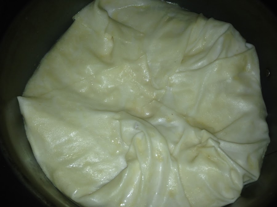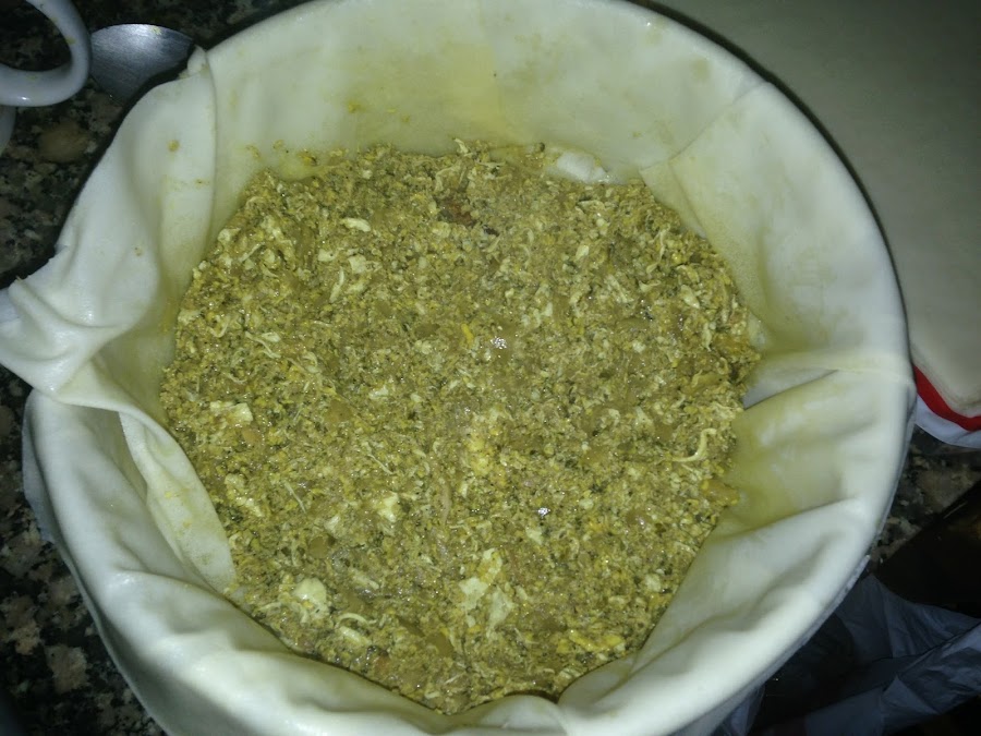 Ponemos varias hojas de pasta brick hasta cubrir bien el fondo de forma q las hojas cuelguen por los bordes para luego poder cerrar la pastela ( cada hoja de pasta se unta con mantequilla). Ponemos todo el pollo desmigado y volvemos a cubrir con las hojas de pasta untadas en mantequilla que necesitemos de la misma manera q la vez anterior y ahora ponemos la salsa de huevos.
