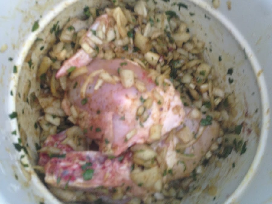 Lo primero que vamos hacer es limpiar bien el pollo y quitarle la piel. A continuación picamos las cebollas y las ponemos a sofreír en aceite. Agregamos la sal, el perejil picado, la cucharadita de jengibre, de cúrcuma, de pimienta negra y de canela solo pondremos media y reservaremos la otra media. Añadimos el pollo y dejamos sofreír todo unos 5 minutos. Cubrimos con agua y dejamos hacerse el pollo a fuego medio-bajo unos 45 minutos o 25 si es en olla expréss