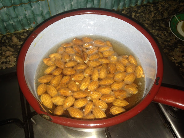 Vamos a ir preparando las almendras. Lo primero que haremos será quitarles la piel y para ello las vamos a poner en un cazo con agua hirviendo y a los 3 minutos las vamos a sacar, de esta manera la piel sale prácticamente sola.