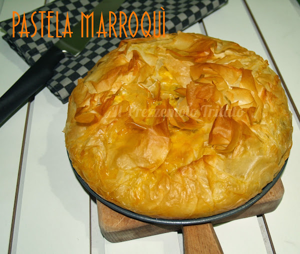 Para hacer la base de la pastela vamos a utilizar pasta filo para manejarla y que no se rompa ni se seque, vamos pintando cada hoja con mantequilla derretida. Engrasamos un molde de 24 cm. y vamos colocando las hojas en forma de abanico, ponemos el relleno dentro del molde y batimos los huevos y los ponemos encima del relleno, cerramos la masa hoja a hoja nos quedaran las puntas hacia arriba lo que dará textura a la masa. Horneamos durante 20 min. o hasta que la pasta este dorada. Sacamos la pastela del horno y dejamos enfriar y espolvoreamos con azúcar glass y canela.