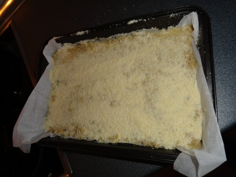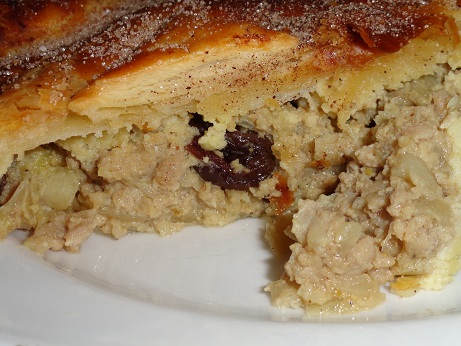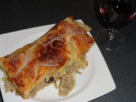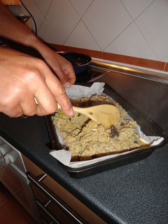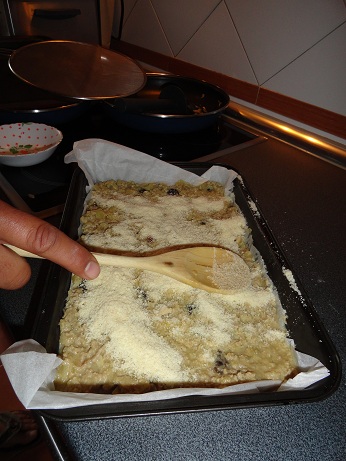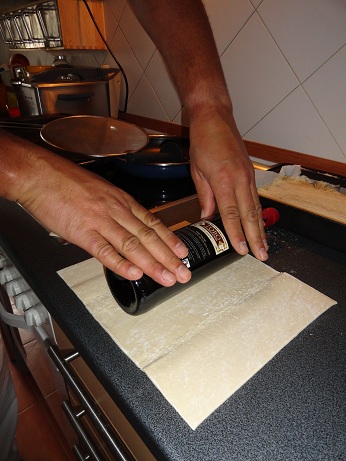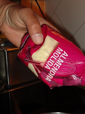6.-Sobre el hojaldre poner el relleno y encima echar una capa de almendras molinas y cerrar todo con la otra capa de hojaldre cerrando por los bordes. (si hace falta, con un rodillo, extender un poco la masa para que sea algo más grande y pueda cerrar; como yo no tengo rodillo lo hice con una botella de, eso sí, un magnífico riverita que quita la cabeza de weno)