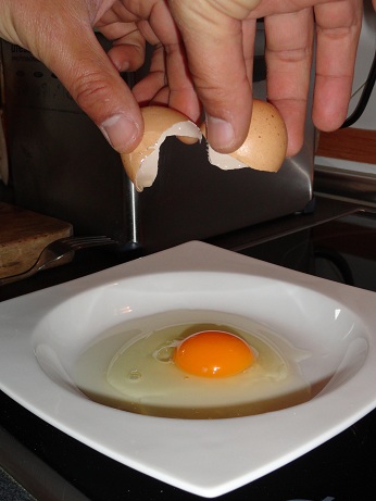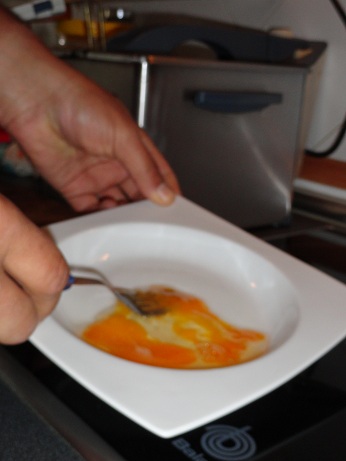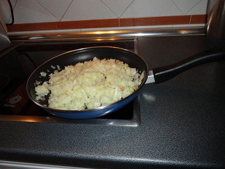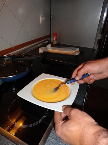 3.-Batir tres huevos y echarlos en la sartén con todo lo demás y el fuego apagado y remover.