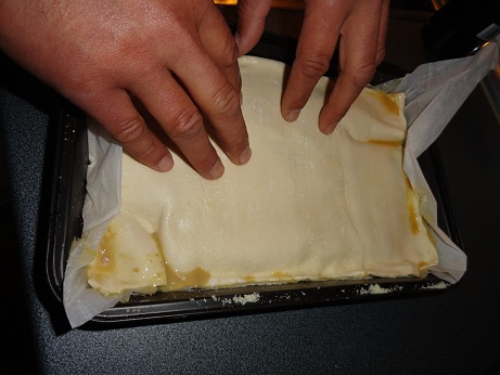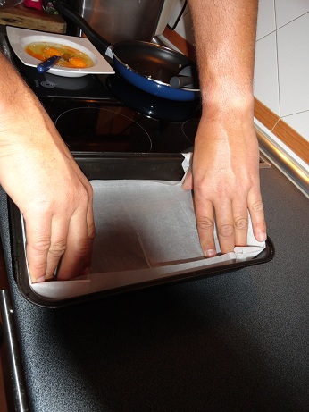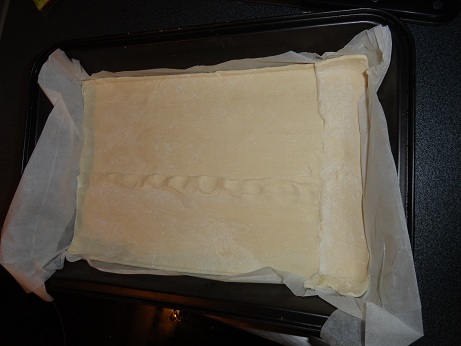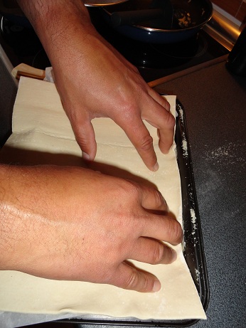 5.-En la bandeja del horno poner un papel de esos de horno (que suele venir en el paquete de la masa de regalo) y extender una de las capas de masa de hojaldre.