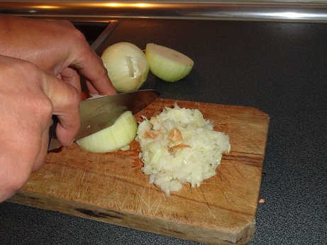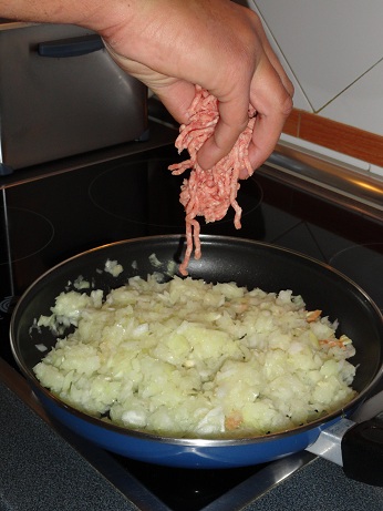 1.-Picar las cebollas finas y rehogar en una sartén grande y cuando esté doradita echar la carne y morear.