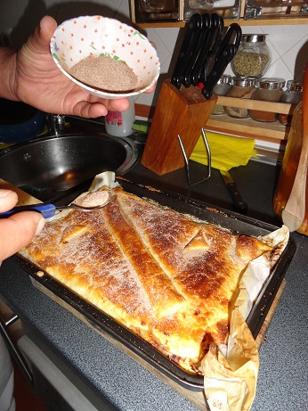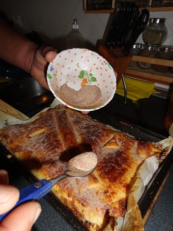 8.-Horno: 30 minutos a 200°c. Cuando dore quitar del horno y sacar. Espolvorear con azúcar glass y canela en polvo por lo alto de la “pieza”.