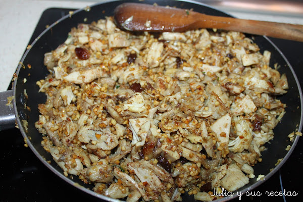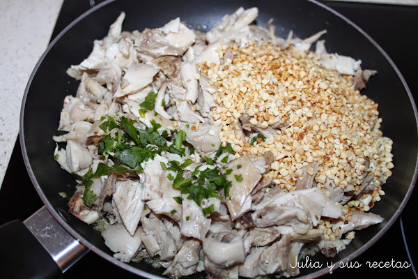 Añadimos el pollo, un poquito de cilantro picado y las almendras tostadas. Lo rehogamos todo.
