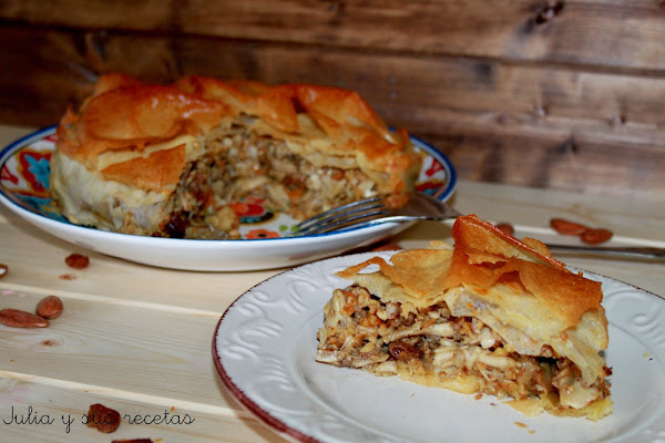 Hola, hola... ya se que en verano no hay Desafío en la cocina obligatorio, sino voluntario, de hecho no se publicaran las recetas en el blog del desafío sino en el blog respectivo de las participantes... El mes pasado no pude participar, pero éste mes si, y lo voy a hacer con un plato que tenía muchas ganas de hacer, una Pastela moruna. Cuando lo propusieron en el desafío, a mi me tocó le Chiko rolls, y me quedé con muchas ganas de probarla. por eso cuando nos dieron la oportunidad de hacer uno de los desafíos que mas nos apeteciera me decidí por ella.