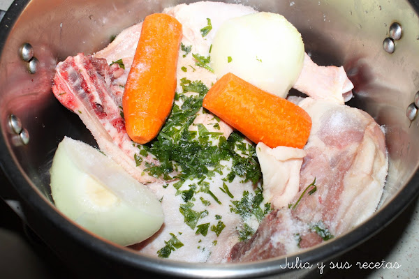 Primero ponemos el pollo en la olla exprés con la cebolla, la zanahoria, el perejil, el cilantro, agua y sal a cocer al menos 15 minutos.