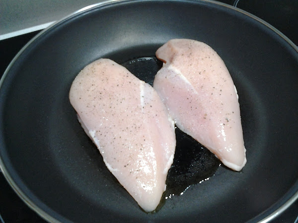 Ponemos un chorrito de aceite en una sartén, salpimentamos las pechugas y las doramos a fuego lento. Cuando estén listas las sacamos a un plato y reservamos.