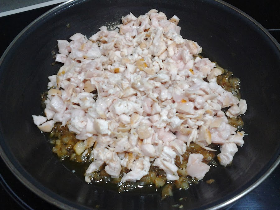 Picamos las pechugas de pollo y añadimos al sofrito. Podéis comprar las pechugas ya picadas y saltaros este paso pero yo prefiero hacerlo así.