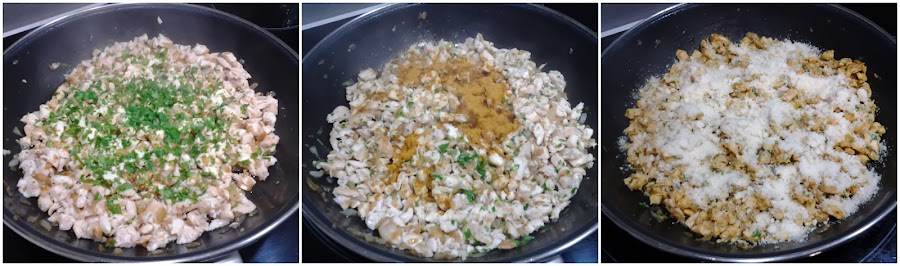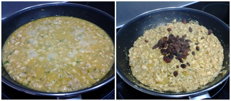 Sofreímos todo junto, cubrimos con un poco de agua o caldo de pollo y dejamos hervir hasta que reduzca y se quede como una salsita espesa. Agregamos las pasas, rectificamos de sal y reservamos.