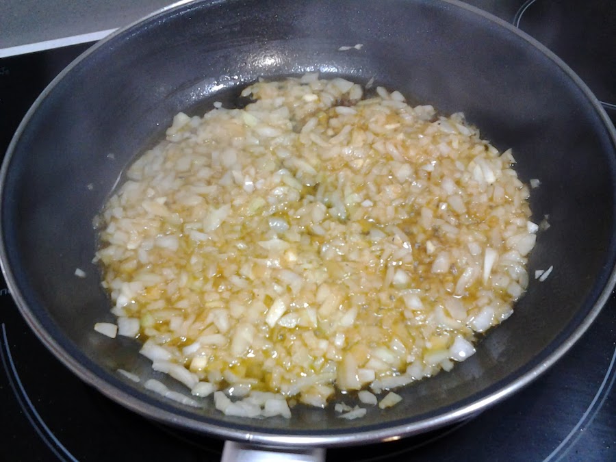 Agregamos un poco mas de aceite a esa sartén y rehogamos la cebolla bien picada.