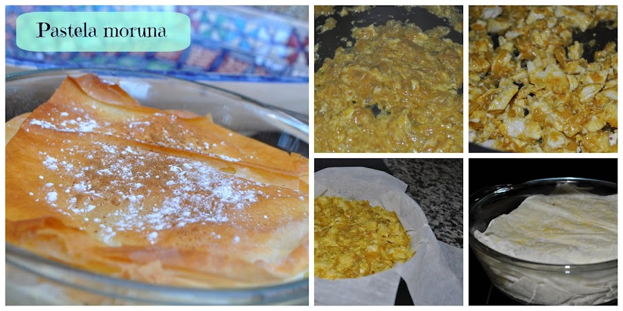 Disponemos de todos los ingredientes para formar la pastela, encima de la mesa, incluida la mantequilla derretida. Esto es porque la pasta filo se seca rápido si está en contacto con el aire. Cubrimos nuestro molde con las láminas de pasta filo, que quede bien cubierto y que sobresalga por los lados para luego poder envolver la pastela. Cada vez que pongamos una lámina, pincelamos con mantequilla derretida. Rellenamos con la mezcla de pollo y ponemos otra lámina de filo. Echamos las almendras encima y volvemos a cubrir con la pasta filo. Al final, envolvemos la pastela con las láminas que tenemos a los lados para darle forma a la pastela. Pincelamos con matequilla derretida y metemos en el horno 180ºC durante unos 15 minutos.