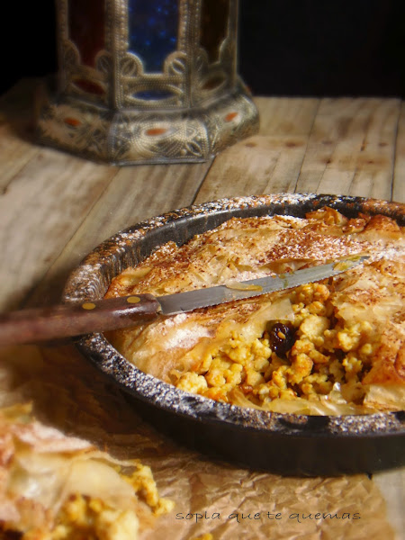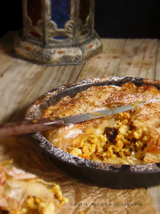 La receta elegida fue Breuas morunas, los mismos ingredientes que mi pastela pero con otro formato, en el blog de Raquel veréis perfectamente lo que es. Con todos los ingredientes comprados y muchas ganas de probar las breuas, me puse manos a la obra, todo iba bien hasta que tuve que poner el relleno en la pasta filo....ahí empezó el desastre, fui incapaz de darles forma, el relleno se me iba por todos los sitios y los que lograba enrollar tenían una forma horripilante, la pasta filo se me secaba...en fin, a punto estuve de tirar la toalla, hasta que se me ocurrió lo mas fácil, darle forma de pastela, asi que, lo siento Raquel, te he cambiado la receta, pero no quería dejar de participar
