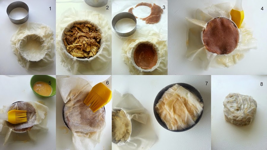 Ponemos un aro para emplatar, sobre este ponemos un circulo de pasta phillo o brick forrando muy bien el interior del aro (1), rellenamos con el pollo hasta un poco mas de la mitad (2), colocamos el circulo de almendra que habíamos reservado (4). Pintamos con huevo la pasta phillo que sobra y empezamos a envolver el relleno, doblando un lado de la pasta sobre el relleno (5), pintar con huevo nuevamente, doblar sobre este el lado opuesto de la pasta, pintar con huevo (6) y así los otros dos lados hasta terminar (7). Retirar el aro, darle la vuelta dejando la parte de la envoltura hacia abajo (8) y poner en una bandeja, pintar con aceite de oliva la superficie y llevar a horno pre calentado por 20 minutos. Retirar y regar con canela molida y azúcar glass.