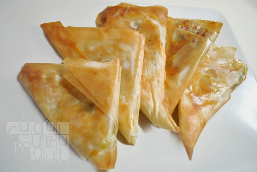 Cogemos dos laminad de masa filo y la untamos con mantequilla fundida (10 segundos en el microondas) y en la esquina inferior del triángulo colocamos una cucharada sopera de relleno de verduras, un trocico de caballa en conserva y otro trocico de queso de untar.