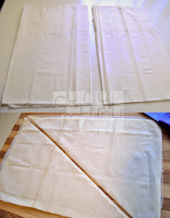Mientras tenemos las verduras escurriendo el aceite cortamos las laminas de masa filo primero por la mitad y esas mitades las cortamos en triángulos.