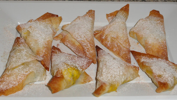 Una vez formados los triángulos lo ponemos en el horno previamente calentado a 180º unos 10-12 minutos, o hasta que veamos que la pasta está doradita y crujiente. Luego se espolvorea con azúcar glass mezclada con una pizquita de canela molida.