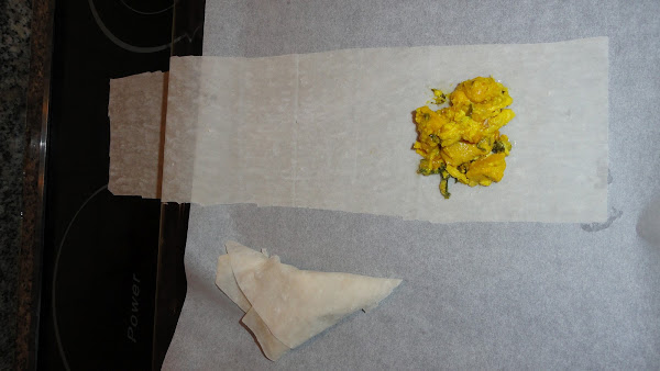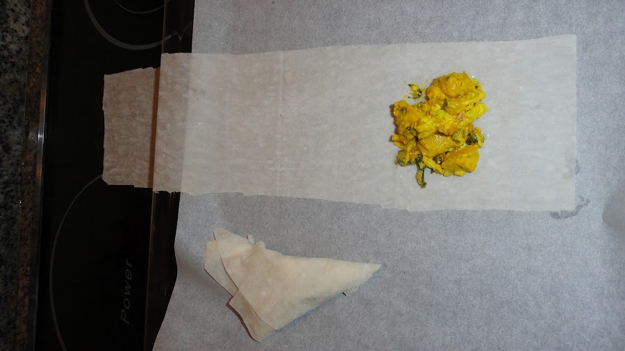 Dejamos templar y una vez templada la masa vamos formando los triangulitos en la pasta filo, doblamos lado pico, lado pico... es difícil explicar. Del tamaño que más nos guste, pero pequeñitos quedan muy bien y cómodos para comer.