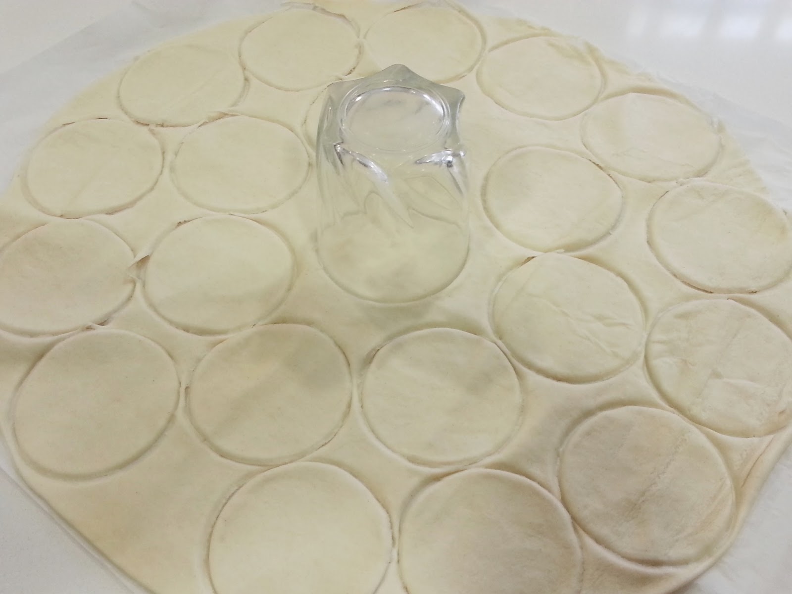 4. - Encendemos el horno a 180º y vamos haciendo círculos en la masa de hojaldre, yo he utilizado unas flanera de silicona engrasadas, podéis usar cualquier tipo de flanera, y los círculos deben ser mas grandes que el fondo, que sobresalgan hacia arriba.