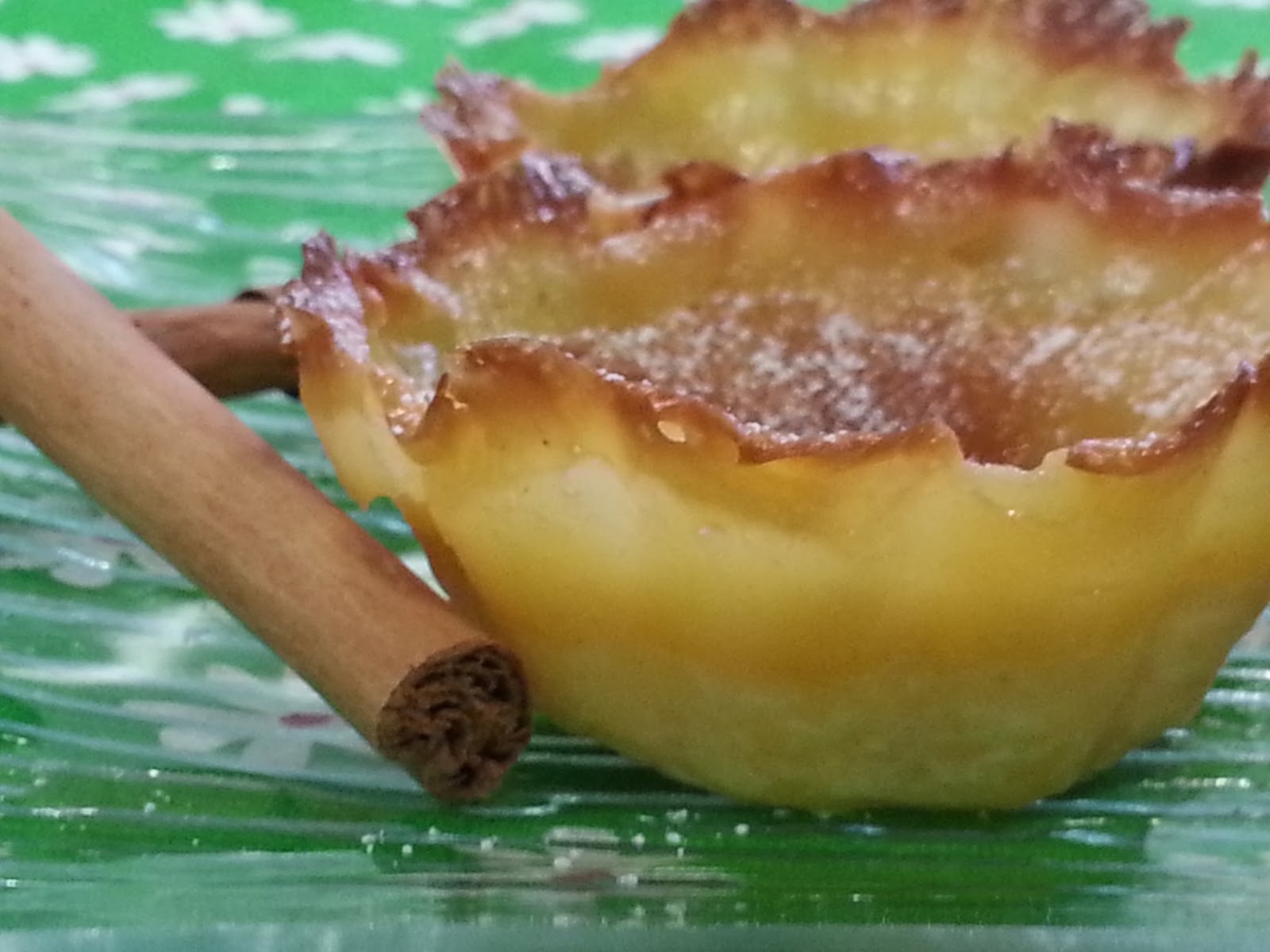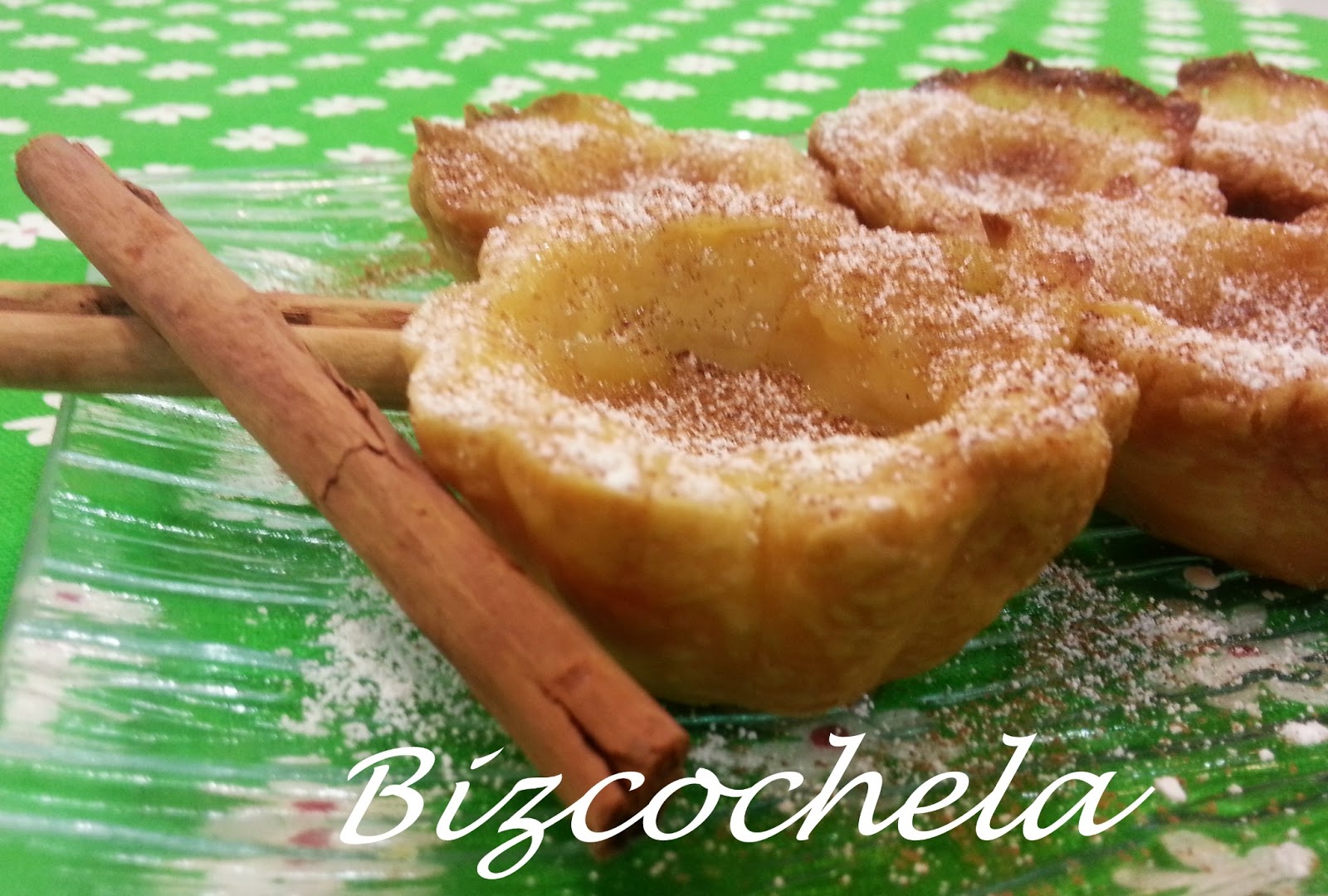 4 yemas de huevo una cucharada de esencia de vainilla Azúcar glas para espolvorear Canela para espolvorear Una placa de hojaldre