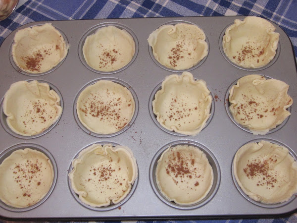 Extendemos el hojaldre y con un aro cortamos discos , los vamos poniendo en nuestra bandeja, de magdalenas, en mi caso, espolvoreamos el hojaldre con canela.