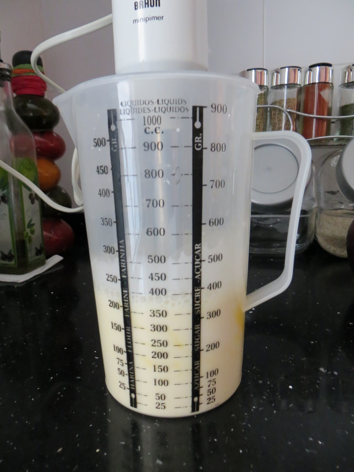 Ahora encendéis el horno a 230º para que se vayan calentando, mientras preparáis la crema batiendo la nata (crema de leche), las yemas y el huevo, una vez que tenéis todo integrado, se añade el almíbar frío.