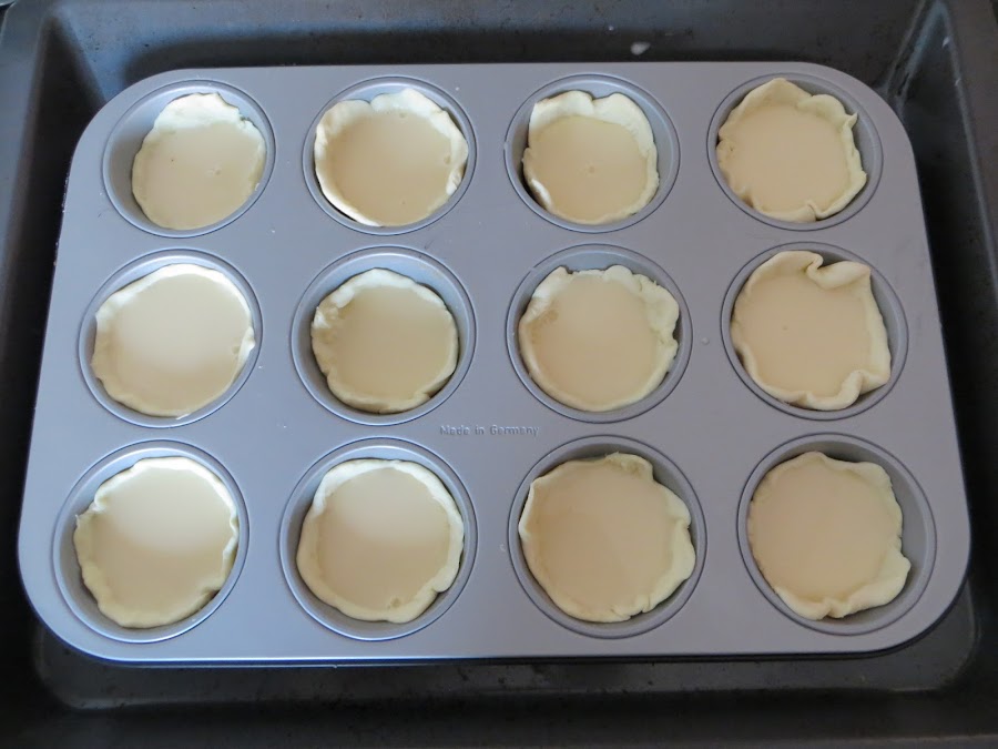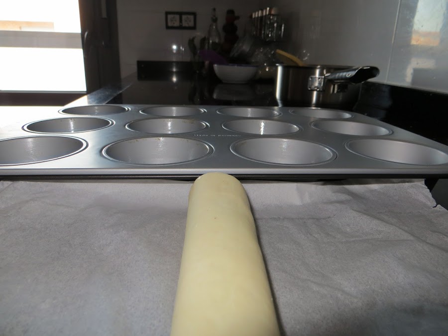 A continuación, cogemos la lámina de hojaldre y la enrollamos por el lado más ancho. Se cortan rodajas de un dedo de ancho. Para hacer los pasteles utilicé un molde de magdalenas, aunque os aconsejó que echéis en cada uno de los huecos aceite de girasol o mantequilla para que sea más fácil desmoldar los dulces. Ahora cogéis cada disco y con las manos les vais dando forma para colocarlos en la cavidad del molde, primero los aplastáis y luego les dais la forma deseada, algunos os quedarán más anchos y otros más estrechos, pero mientras no se rompa la masa, no os preocupéis.