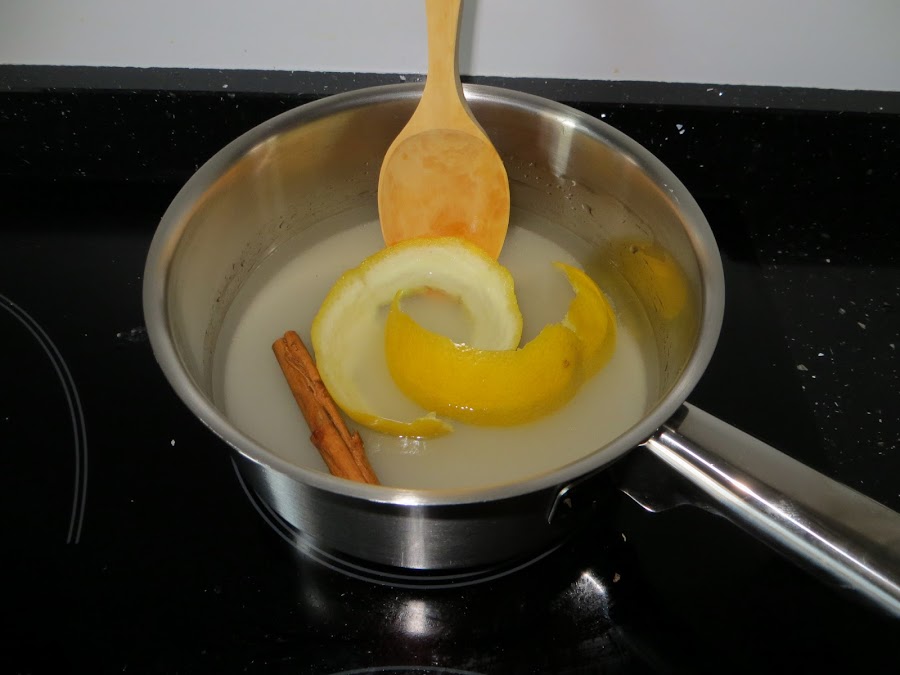 Lo primero que vamos a elaborar será el almíbar con el agua, el azúcar, la canela en rama y la corteza de limón. Lo calentamos hasta que hierva y lo dejamos enfriar, para luego colarlo.