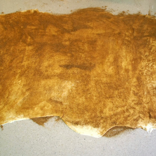 A continuación, una vez extendida la lámina de hojaldre, espolvoreamos por encima canela en polvo y la extendemos por toda la superficie. Quedará algo con este aspecto: