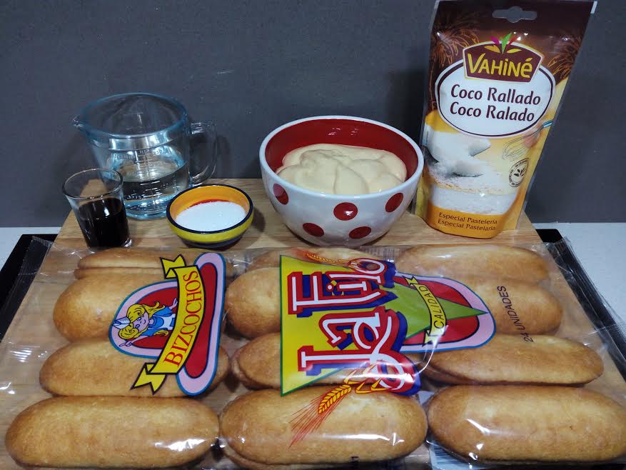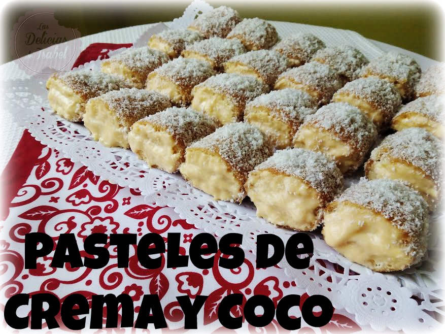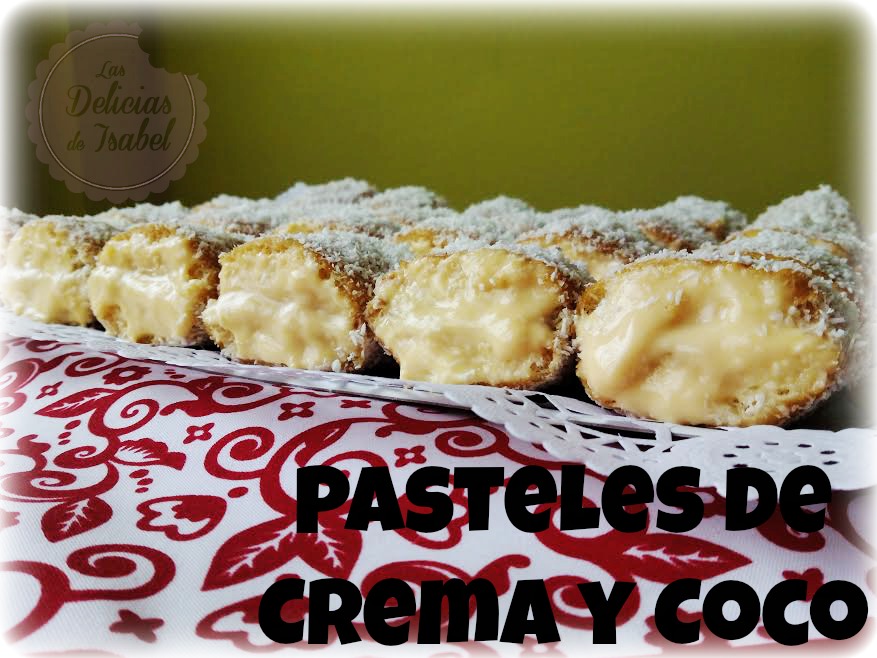 Untamos las soletillas con la crema y cerramos a modo de sandwich. Mojamos en el almíbar y rebozamos en el coco rallado. Cortamos a la mitad y cubrimos la zona del corte con crema pastelera.