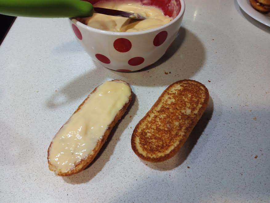 Lo primero que debéis hacer es tener preparada la crema pastelera. Podéis ver la receta y el paso a paso aquí. Seguidamente preparamos el almíbar. Ponemos el agua con el azúcar y el ron en un cazo, cuando comience a hervir lo tenemos un par de minutos y reservamos.