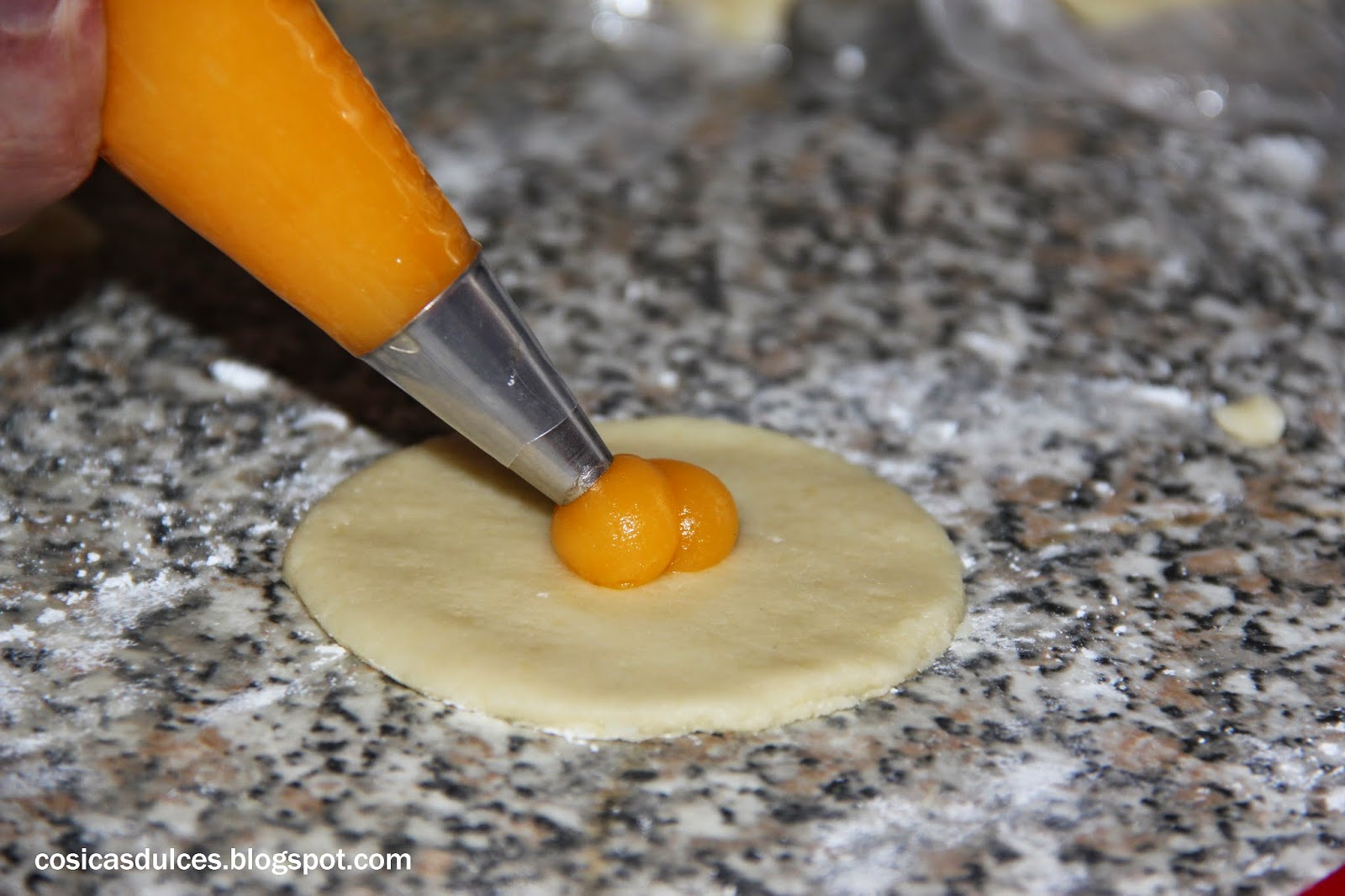 Después del reposa estiramos la masa finita (unos dos milímetros aproximadamente) y cortamos círculos de unos 8 centímetros de diámetro. En el centro ponemos un punto de crema de yema y envolvemos formando un paquetito.