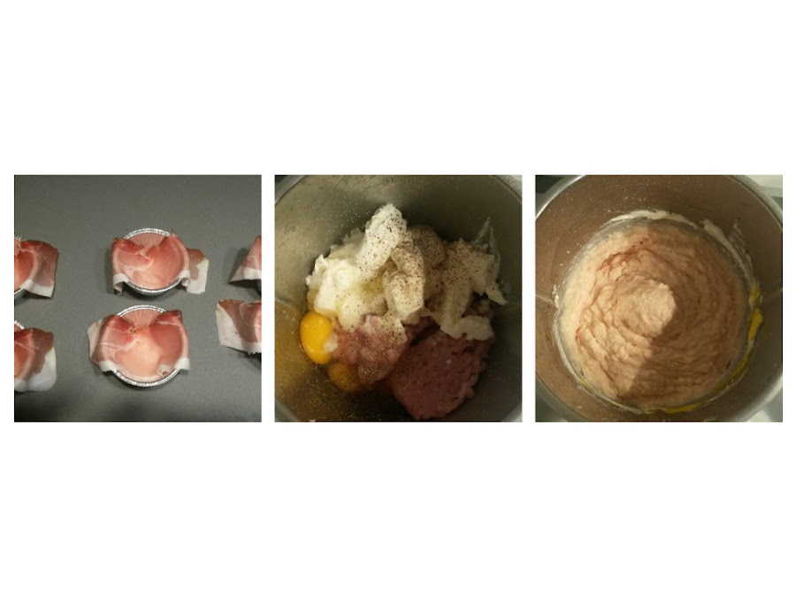 2. Coger los moldes de aluminio y poner en cada uno 1 loncha de jamón o speck (como en la foto).