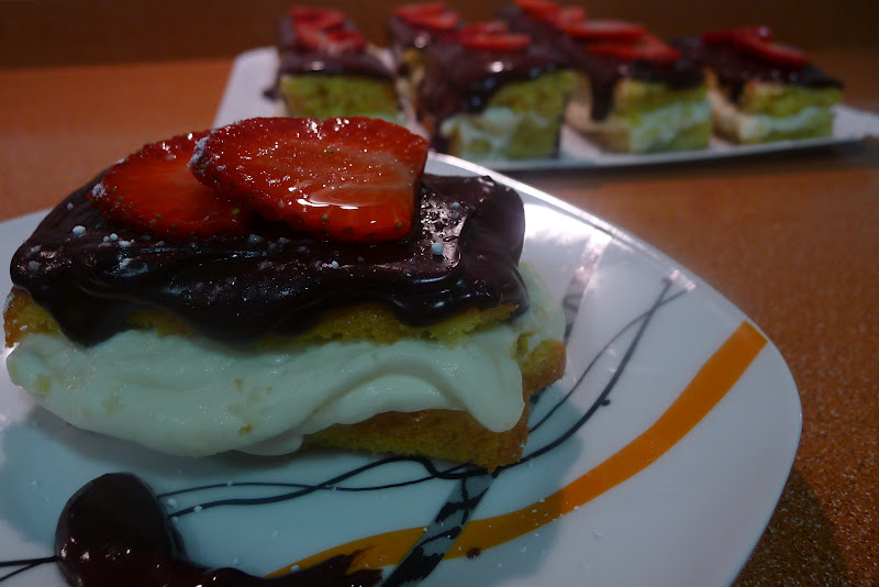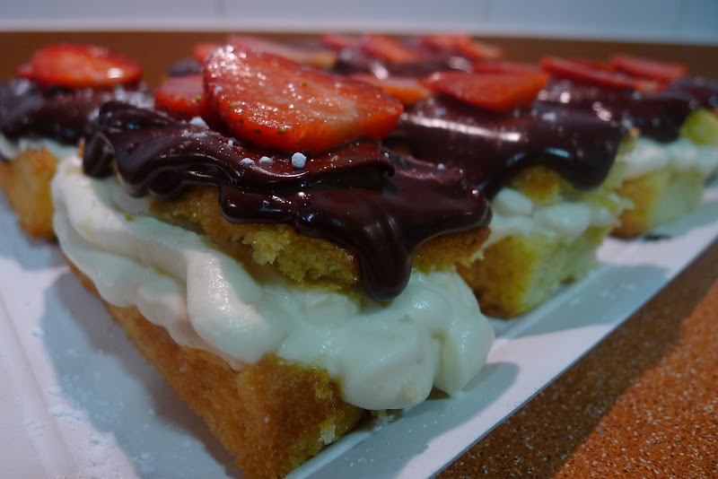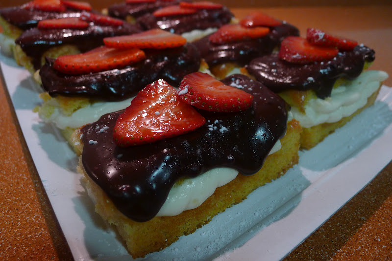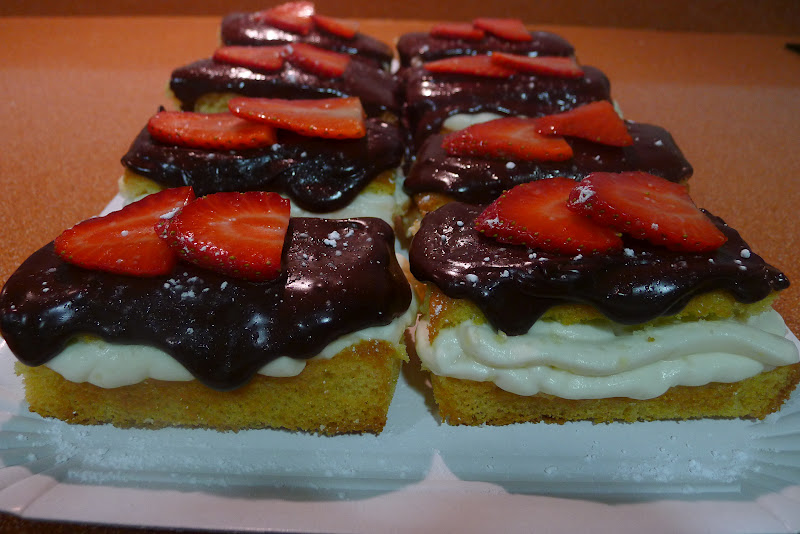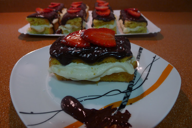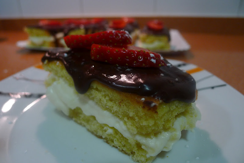 Una vez calados todos,procedemos a rellenarlos con la crema suiza,que habremos metido en la manga pastelera o bolsa de congelacion en mi caso!.Con este paso hecho,tapamos con el bizcocho de arriba y solo nos queda la cobertura de chocolate.