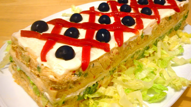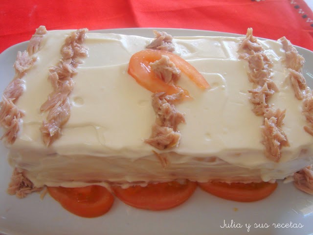Los ingredientes son: pan de molde, quesitos, tomate frito, anchoas, atún de lata, mantequilla y mayonesa. Hay que remojar el pan un poco en agua de la manera que nos explica Julia, luego se preparan varios rellenos combinando los ingredientes y se forman capas con el relleno y el pan. finalmente se cubre con mayonesa y se decora con un poquito de gracia.