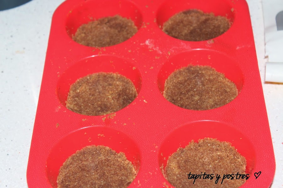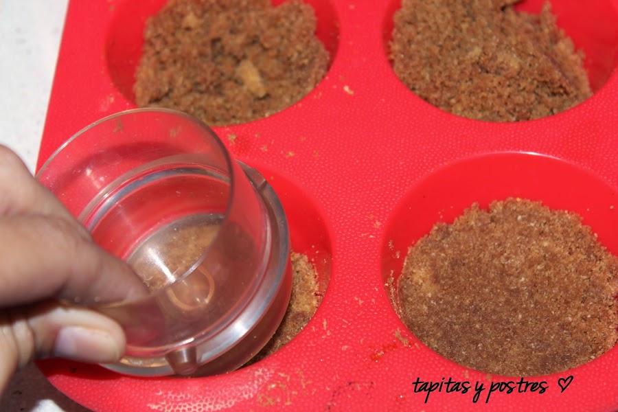 Ahora ponemos la misma cantidad en los huecos de un molde de magdalenas de silicona y las aplastamos con el cubilete. Que quede bien compacto.