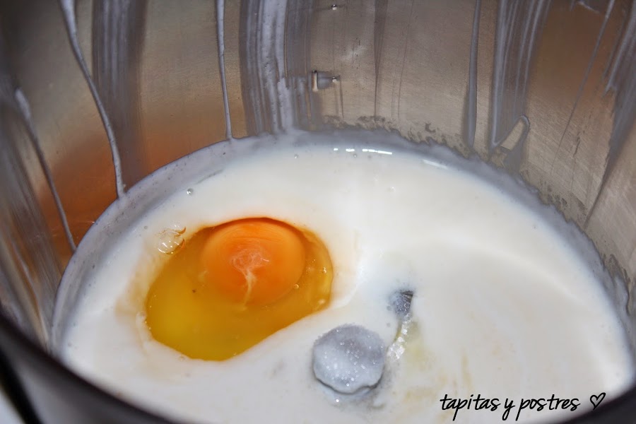 Añadimos un huevo y mezclamos 15 segundos a velocidad 2. Cuando esté bien integrado echamos el otro huevo y volvemos a batir.