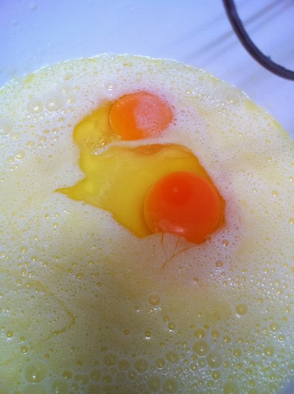 A continuación, añadiremos los dos huevos y las 6 cucharadas de azúcar ( 130 gr )