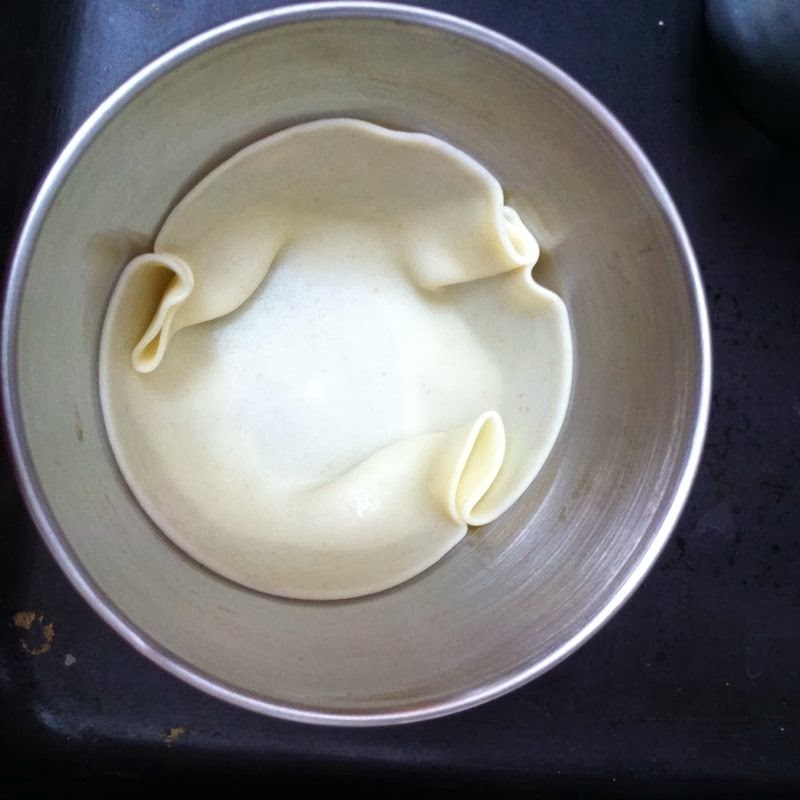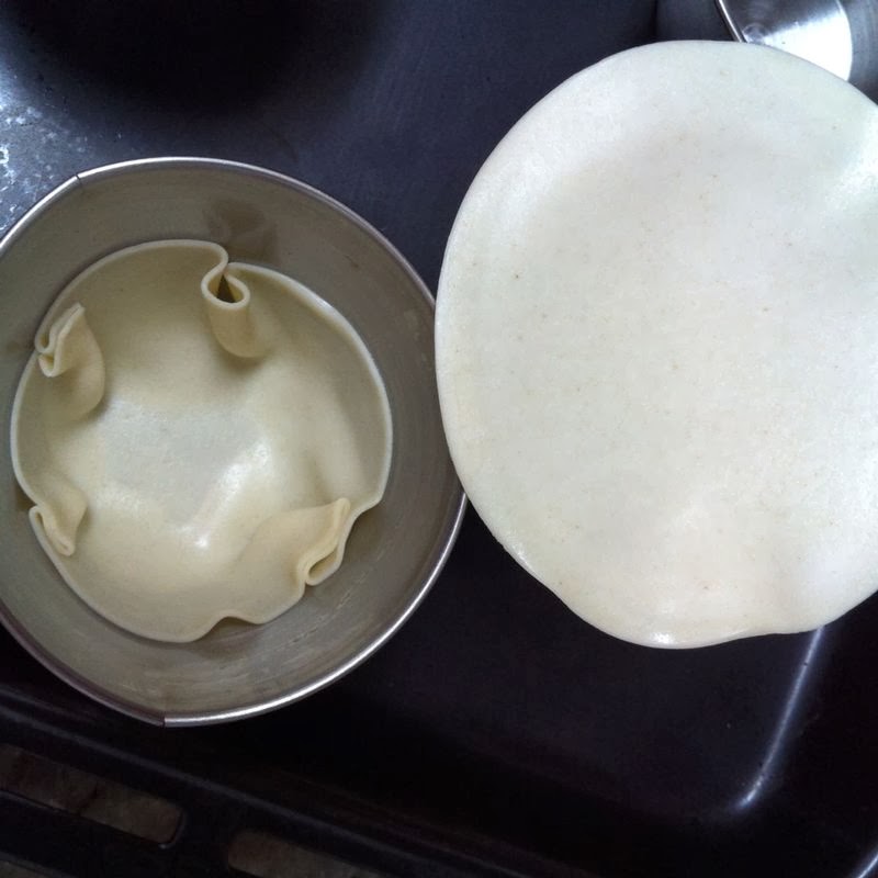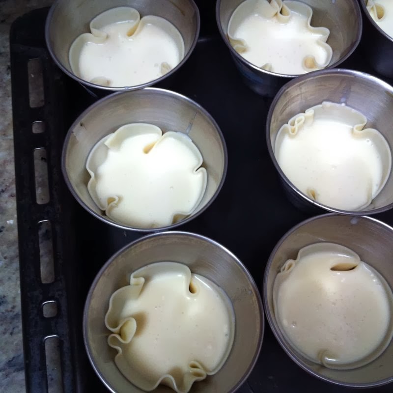 Ahora, mientras precalentamos el horno a 200º, empezaremos a colocar las obleas de empanadillas en los moldes.